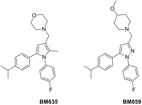 In this scenario, we have developed a potent class of antimycobacterial compounds acting as inhibitors of the essential mycobacterial membrane protein large 3 (MmpL3). Among this class of compounds, the 1,5-diarylpyrrole BM635 and the 1,5-diarylpyrazole BM859 (Figure 1) showed outstanding in vitro activity against Mtb (minimum inhibitory concentration (MIC) = 0.12 µM and 0.3 µM, respectively) as well as good in vivo efficacy in a murine model of TB infection. The main drawback of these potent compounds was the high lipophilicity (8.1 Chrom log DpH 7.4 and 7.31 Chrom log DpH 7.4, respectively) [,].