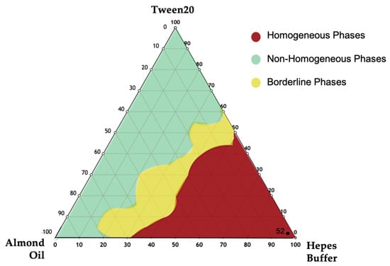 To select the appropriate NEs in terms of hydrodynamic diameter, ζ-potential, and PDI, the ternary phase diagram of almond oil was developed. At first, different formulations were evaluated by visual inspection to delimit the three different zones in the diagram (Figure 3), which included homogenous and non-homogenous ones. In fact, only employing specific ratios of oil, surfactant and water phase (HEPES buffer) at specific concentration, it is possible to obtain a homogeneous dispersion without separation phenomena. The red region represents the homogenous region, and the green zone is the non-homogenous one. In addition, the sonication performed on the samples in the non-homogenous zone led to formation of monophasic dispersion represented by the yellow zone (or borderline zone) [,,].