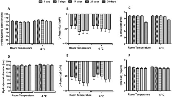 Physical-chemical stability over time of loaded nanocarriers. Effect of storage temperature (room temperature, RT; and 4 °C) on hydrodynamic diameter (panels (A,D)), ζ-potential (panels (B,E)) and concentration (panels (C,F)) for BM635-loaded NEs and BM859-loaded Nis. Data were obtained as the mean of three independent experiments.