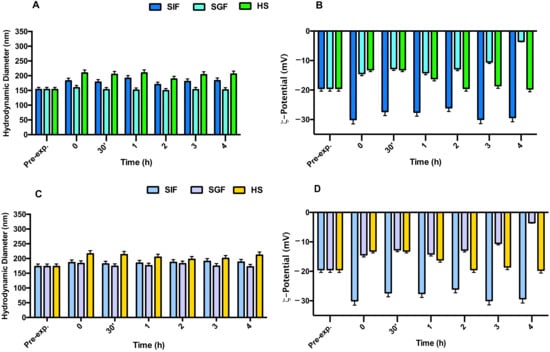 The biological stability of NEs and NIs in the presence of SGF, SIF, and HS were evaluated. In particular, a mixture of NEs and Nis, and 45% of the fluid was prepared and placed at 37 °C. By DLS (Malvern Instruments, Worcestershire, UK), the mixture was analyzed at different time intervals (0, 0.5, 1, 2 and 3 h) to evaluate the particle size and ζ-potential.