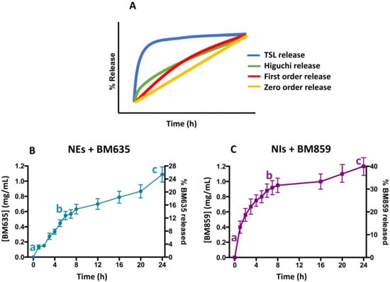 In order to evaluate the NEs-NIs’ capability to release the entrapped drugs, release studies were performed. The aim of these studies was to understand how the different nanocarriers could influence the release of the entrapped drugs. In particular, Figure 6 shows the concentration versus time profiles of both active compounds released by the formulations. Both nanocarriers show high initial release, followed by a decreasing release rate. From Figure 6, it is possible to hypothesize the release kinetic model in comparison with literature data. In this case, the release curves of both formulations could be described as a bimodal release ref. More specifically, there was a faster release initially (a–b), followed by a relatively slow release (b–c), thus forming a “Γ” shape-like curve []. It is possible to observe that the total amount of BM635 released from NEs is around 30%, whereas 40% of BM859 is released from Nis. The slightly different release could be due to the different microviscosity values of NEs + BM635 and NIs + BM859. The loaded NEs formulation is characterized by a higher microviscosity value (2.5) compared with that of NIs (0.82), probably because BM635 is more lipophilic than BM859 (8.1 and 7.31).