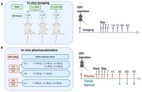 Study design to determine the effects of injection volume, number of injections and route of administration on ISFI degradation and drug release: (A) B mode ultrasound imaging of placebo ISFIs: SQ (1 × 80 μL, n = 8 mice/group and 2 × 40 μL, n = 5 mice/group) and IM (1 × 40 μL, n = 10 mice/group). (B) Pharmacokinetic study of 100 mg/mL and 250 mg/mL DTG ISFIs injected via SQ and IM with varying number of injections and injection volumes (n = 10 groups; n = 12 mice/group; n = 120 total mice).