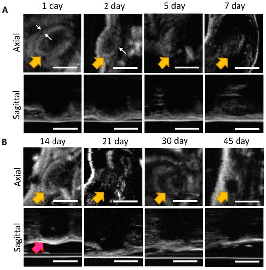 Representative B mode ultrasound images of axial and sagittal views of 80 L placebo ISFI (1:2 w/w PLGA/NMP) ISFIs injected into female NSG mice (n = 8) taken over 45 days: (A) Days 1–7 (B) Days 14–45. Yellow arrows indicate location of the ISFI, white arrows indicate precipitation of PLGA, and pink arrows represent ISFI flattening. Scale bar = 5 mm.