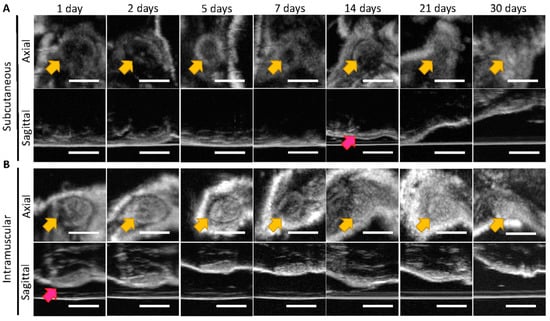 Representative B mode ultrasound images: (A) SQ (B) IM of axial and sagittal views of 40 L placebo ISFI (1:2 w/w PLGA/NMP) ISFIs injected into female NSG mice (n = 5) taken over 30 days. Yellow arrows show ISFIs in the axial, and the timepoint at which the ISFI flattens is shown by the pink arrows. Scale bar = 5 mm.