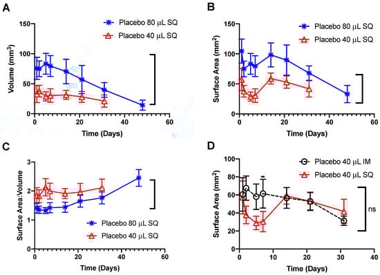 Volume and surface area of 80 L (n = 8 mice/group; 1 ISFI/mouse) and 40 L (n = 5 mice/group; 2 ISFIs/mouse) placebo ISFIs (1:2 w/w PLGA/NMP) injected into female NSG mice: (A) Volume of 80 and 40 L SQ placebo ISFIs over 45 days (p = 0.0043), calculated by segmenting the ISFI boundary from multiple slices across 3 dimensions and interpolating the segmented volume. (B) Surface area of 80 and 40 L SQ placebo ISFIs over 45 days (p = 0.0027), calculated by segmenting the ISFI boundary from multiple slices across 3 dimensions and interpolating the segmented surface area. (C) Surface area to volume ratio of 80 and 40 L SQ placebo ISFIs over 45 days (p = 0.0281). (D) Surface area of SQ and IM 40 L placebo ISFIs over 30 days (n.s.; day 7 individual p < 0.001). All statistics were unpaired t-tests.