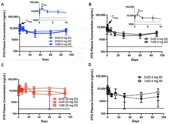 DTG plasma concentrations of 4 × 20, 2 × 40, and 1 × 80 L DTG-loaded ISFIs (1:2 w/w PLGA/NMP) injected into female NSG mice (n = 10 mice/group). Each graph compares the effect of injection volume when keeping total dose constant, the black dashed line represents the 4 × PA-IC90 for DTG (256 ng/mL): (A) PK of 100 mg/mL DTG ISFIs given SQ with 8 mg total dose. Inset: PK through day 10 to show Cmax at Day 1. (B) PK of 100 mg/mL DTG ISFIs given SQ with 4 mg total dose. Inset: PK through day 10 to show Cmax at Day 1. (C) PK of 250 mg/mL DTG ISFIs given SQ with 20 mg total dose. (D) PK of 100 mg/mL DTG ISFIs given IM with 4 mg total dose.