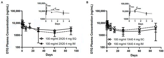 Comparing PK of 100 mg/mL DTG SQ and IM ISFIs with inlay graph through day 4 (A) 2 × 20 L; 4 mg total dose (B) 1 × 40 L; 4 mg total dose.