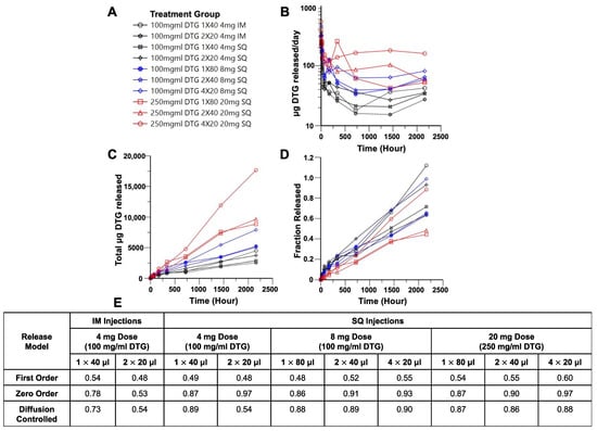 Median estimated deconvolution parameters of 4 × 20, 2 × 40, and 1 × 80 L DTG-loaded ISFIs (1:2 w/w PLGA/NMP): (A) Legend for panels B–D. (B) Median estimated DTG release rate over 90 days. (C) Median estimated cumulative DTG mass over 90 days. (D) Median estimated fraction of loaded DTG dose over 90 days. (E) r2 values for mathematical models of first order, zero order, and diffusion-controlled (Higuchi model) release.