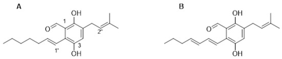 Since the first report in 1934 of FG and DAG from the terrestrial fungus Aspergillus glaucus [7], this growing class of C7 alkylated salicylaldehyde derivatives [8] has been described to possess a broad spectrum of biological activities: antioxidant and radical scavenging properties [9,10,11], antimicrobial, antibiofilm [12], and antifouling activities [3], anti-inflammatory [13,14] and skin-protective properties under oxidative stress condition [15] as well as binding affinity to human opioid or cannabinoid receptors [16].