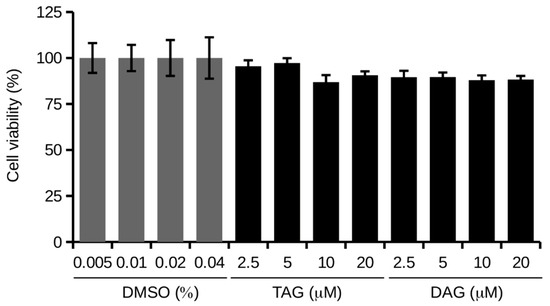 Cell viability was determined by MTT assay. SH-SY5Y cells were treated with different concentrations (2.5, 5, 10, and 20 μM) of TAG and DAG molecules in HI-FBS medium for 24 h.