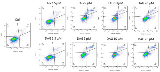 Evaluation of apoptosis in SH-SY5Y cells after the treatment with TAG and DAG molecules at different concentrations (2.5, 5, 10, and 20 μM) for 24 h in HI-FBS medium. The analysis conducted by FACS through Annexin V/7-AAD cell staining is depicted as a typical flow cytometry dot-plot image.