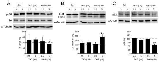 Effect of TAG and DAG on autophagic markers expression in SH-SY5Y cells. Cells were treated with 2.5 or 5 μM of TAG and DAG for 24 h. Control cells (Ctrl) were treated with two doses of DMSO vehicle, i.e., (1) 0.005% DMSO and (2) 0.01% DMSO. Expression levels of protein autophagic markers, i.e., (A) p-S6/S6, (B) LC3-II/LC3-I, and (C) p-62, were detected by Western blot assay. Quantification of signals was determined by densitometry analysis. Error bars represent standard errors. * p < 0.05; ** p < 0.01 vs. Ctrl (represented by dashed line); Kruskal–Wallis test.