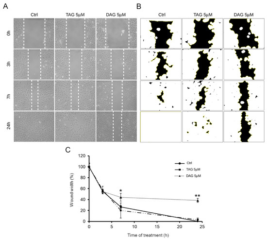 Effect of TAG or DAG on SH-SY5Y cell migration. (A) Wound healing assay on SH-SY5Y cells treated with vehicle (Ctrl) or with 5 μM of TAG and DAG. Scratch closure was monitored up to 24 h. Dashed lines mark the edges of the wound area. (B) Representative image of wound width (black area) obtained by the image analysis software ImageJ for the quantitative analysis (C) Time course analysis of scratch closure in TAG and DAG treated cells or control cells. The wound width for each time point was measured and quantified by using the image analysis software ImageJ. Mean values of wound width at the various time points were reported in percentage terms relative to time 0. Values are represented as means ± SD from three different experiments. Tukey’s test. * p < 0.05; ** p < 0.01 vs. Ctrl.