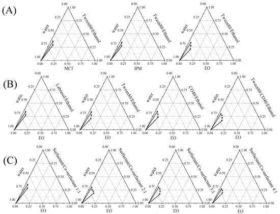 Pseudo-ternary phase diagram in different components. Oil phases (A), surfactant phases (B), and surfactant/co-surfactant ratios (C).