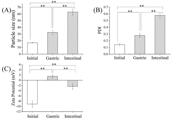 The effects of simulated gastrointestinal tract digestion on the physical characteristics of GME. Mean particle size in nm (A), polydispersity index (B), and zeta potential (mV) (C) of GME at the initial, gastric, and intestinal phases., ** p ≤ 0.01.