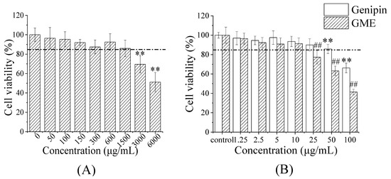 Neuroprotective effect of GME. Aβ1-42 damage concentration (A), and the effect of free genipin and GME (B). Different letters (a,b,c,d) indicate a significant difference in the Genipin group; different letters (A,B,C,D,E) indicate a significant difference in the GME group. * p < 0.05, ** p < 0.01.