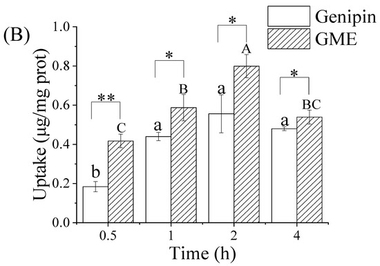 Cellular uptake of GME quantified with CLSM and HPLC. Confocal microscopy images of Caco-2 cells. Scale bar = 20 μm (A); HPLC quantification of genipin uptake by Caco-2 cells treated by free genipin and GME at 37 °C for 0.5, 1, 2, and 4 h (B). Different letters (a,b) indicate a significant difference at different time in the Genipin group; different letters (A,B,C) indicate a significant difference at different time in the GME group. * p < 0.05, ** p ≤ 0.01. Compared with the group treated with the same concentration of free genipin.