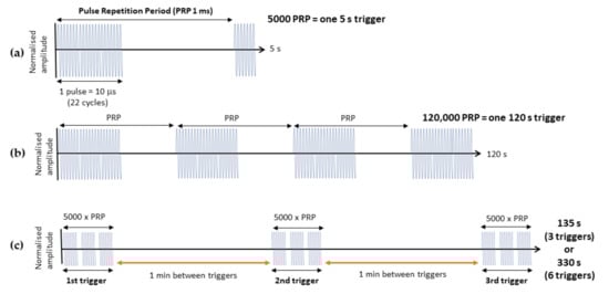 Schematic of ultrasound parameters. (a) One pulse consists of ~22 cycles, generated from a 2.25 MHz transducer with a pulse length of 10 μs. Since the PRF is 1 kHz, the pulse repetition period (PRP) is 1 ms, and hence with a pulse length of 10 μs, the duty cycle is 1%. A 5 s sonication time with these parameters will deliver 5000 PRPs and is termed one 5 s trigger. (b) Increasing the ultrasound trigger from 5 s to 120 s delivers 120,000 PRP and is termed one 120 s trigger. (c) Multiple triggers were created from the 5 s trigger sequence with a one min wait time between each trigger.