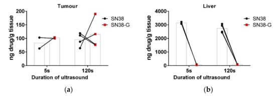 Increasing the duration of the ultrasound trigger. The effect of increasing the ultrasound trigger from 5 s to 120 s after bolus injection on drug delivery (SN38) and metabolism (SN38-G) 30 min later. Linked data points show the results from individual mice, with the bar in grey showing the mean. No difference was apparent between 5 s (n = 2) and 120 s (n = 4) for either SN38 or SN38-G in tumour (a) or liver (b).