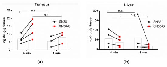 Thirty minutes to one hour (see figure legends for collection time point used per experiment) after injection, tumours and livers were harvested and snap-frozen in liquid nitrogen. These time points allowed drug metabolism to be measured since SN38-G indicates that SN38 has been released from the liposomes and is available for metabolism. After thawing on ice, tissues were weighed and homogenised in methanol spiked with 10 ng/mL internal standard tolbutamide (Sigma-Aldrich).
