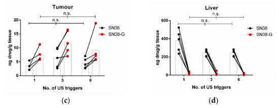Increasing the number of ultrasound triggers. The effect of timing of the US trigger after bolus injection on drug delivery to tumour (a) and liver (b) one hour later. Linked data points show the results from individual mice, with the bar in grey showing the mean. Mann–Whitney U test showed no significant differences (n.s.) between 4 min (n = 4) and one min (n = 3) wait time before a single 5 s US trigger for either SN38 or SN38-G in tumour (a) or liver (b). The effect of increasing the number of 5 s US triggers on tumour drug delivery (c) and liver (d). Linked data points show the results from individual mice, with the bar in grey showing the mean. ANOVA followed by Dunn’s multiple comparisons test showed no significant differences between 1 (n = 4), 3 (n = 5) and 6 (n = 5) US triggers for either SN38 or SN38-G in tumour (c) or liver (d).