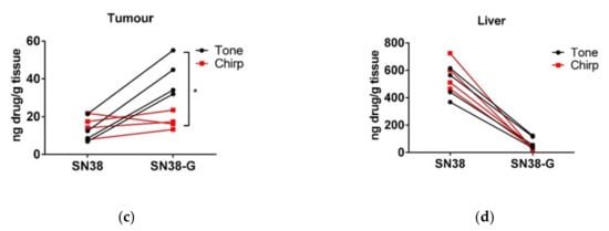 The 5 s tone trigger showed increased metabolism of the chemotherapy delivered compared to the chirp trigger. SN38-G was found in significantly higher amounts in the tumour using a tone trigger, but no difference was found in the liver, which did not receive a direct US trigger. Therefore, a short, higher-pressure tone burst of thMBs was superior to the increased excitation of polydispersed thMBs in a population, using a chirp trigger, in terms of tumour drug delivery.