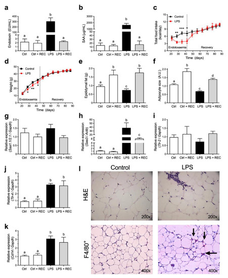 No tolerance to LPS was observed during the experimental protocol, with similar increment profiles in serum endotoxin (Figure S2a, Supplementary Materials) and SAA (Figure S2b, Supplementary Materials) after each LPS challenge. After the endotoxemia period, the animals recovered their weight in the course of one week and presented comparable growth curves when compared to the control group in the 42 consecutive days (6 weeks) (Figure 1c,d). Serum levels of endotoxin (Figure 1a) and SAA (Figure 1b) were back to basal levels after a week with the animals in recovery (LPS + REC). However, the expression mRNA levels of Saa3 (Figure 1h), Tlr-4 (Figure 1j) and Cd14 (Figure 1k) remained increased in the adipose tissue.