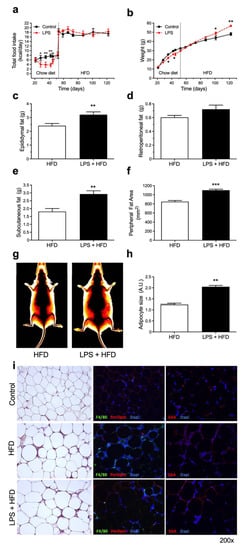 After the end of LPS challenges followed by a one-week recovery period, mice were submitted to a HFD for 70 days (10 weeks) (Figure 1b, Supplementary Materials). HFD-fed mice without previous LPS treatment were used as controls. The shift of chow diet to HFD resulted in an increment of approximately twice in the caloric intake for both groups, HFD and LPS + HFD (Figure 2a). Despite the similar caloric intake between these groups, mice previously submitted to multiple LPS challenges (LPS + HFD) showed a distinct growth curve with a 15% increase in total body weight (Figure 2b), with increased epididymal (Figure 2c) and subcutaneous (Figure 3e) adipose tissue depots and no difference in retroperitoneal (Figure 3d) fat. The data were confirmed using X-rays images highlighting the subcutaneous fat area on the animals, showing that LPS + HDF mice have a larger peripheral fat tissue, with an increment of 23% in the adipose tissue area (Figure 2f,g). Besides that, epididymal fat from LPS + HFD mice presented larger adipocytes when compared to the HFD group (Figure 2h), which may explain differences in their metabolic phenotype. On the other hand, there is no difference in the adipose tissue inflammatory profile, showing similar macrophage infiltration (F4/80+) and SAA production (Figure 2i) in both HFD and LPS + HFD groups. However, it is important to highlight that all aforementioned parameters (adipocyte hypertrophy, macrophage infiltration and SAA production in the adipose tissue) are increased when compared to the lean control group (under chow diet) (Figure 2i).