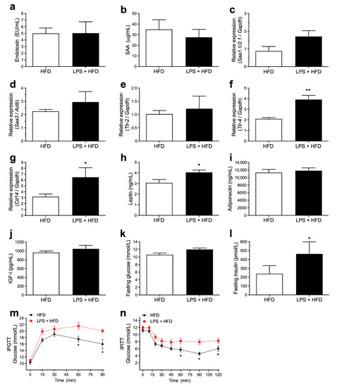 As an effect of the high-fat diet, a 2-fold increase in serum endotoxin and SAA levels was observed in the HFD and LPS + HFD groups when compared to lean mice (Figure 3a,b compared to Figure 1a,b; respectively). However, no differences were observed between HFD and LPS + HFD groups. In a similar manner, transcript levels of Saa3 in the adipose tissue were increased in response to the HFD, regardless of previous treatment with LPS (Figure 3d compared to Figure 1h). mRNA expression levels of Saa1.1/Saa2.1 were similar among all conditions (Figure 3c compared to Figure 1g). Nevertheless, mice previously submitted to multiple LPS challenges showed an increment in Tlr-4 (Figure 3f) and Cd14 (Figure 3g) of mRNA expression in the adipose tissue, with no change in Tlr-2 transcript levels (Figure 3e). Additionally, mice previously submitted to multiple acute endotoxemia had a worsened metabolic profile after the high-fat diet period, showing increased leptin (Figure 3h) and insulin (Figure 3l) levels, with impaired glucose homeostasis, as measured by glucose and insulin tolerance tests (Figure 3m,n). Serum adiponectin (Figure 3i), IGF-1 (Figure 3j) and fasting glucose (Figure 3k) concentrations were also measured, and no significant differences were observed.