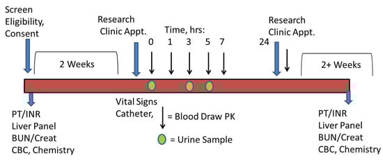 This prospective open-labeled clinical trial undertaken at Georgetown University was an investigator-initiated translational research study based upon a study in mice that showed reversal of hepatic fibrosis and prevention of hepatocellular carcinoma [19]. The protocol and sample size were approved by the Food and Drug Administration (FDA) and the Georgetown University Institutional Review Board (IRB), and the trial was registered on www.clinicaltrials.gov (accessed on 20 February 2022) (NCT04814602). The study was designed to evaluate the effect of hepatic impairment on the pharmacokinetics (PK) of proglumide as related to hepatic function (e.g., Child-Pugh cirrhosis) compared with healthy controls. The principal objective of this study was to develop dosing recommendations so that patients and practitioners can alter the dose and dosing interval appropriately in the presence of hepatic disease, noting that subsequent careful titration and observation are critical in this vulnerable population. Written informed consent was obtained prior to screening subjects for enrollment. The study consisted of two groups of adults (>18 years of age). The first group included healthy controls with normal renal and hepatic function, with normal hepatic transaminases, chemistries, coagulation studies, and complete blood count. The comparator group was those with Child-Pugh stage A or B cirrhosis. Subjects with significant cardiac, pulmonary, or renal disease were not eligible, and those with HIV or untreated viral hepatitis were excluded. Subjects with hepatic transplant or Child-Pugh stage C were excluded from this investigation. Additional exclusion criteria included: subjects with active alcohol or drug abuse in the prior 6 months, current moderate alcohol consumption, evidence of active gallbladder disease or gallbladder dyskinesia, hypersensitivity or anaphylaxis to proglumide, and lactating or pregnant females. The diagnosis of cirrhosis was confirmed by one of the following: liver biopsy, FibroScan, FibroSure, MR elastography, or nodular liver on radiographic imaging including computerized tomography or magnetic resonance imaging (MRI).