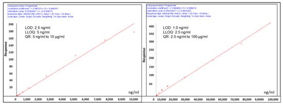 UPLC-MRM mass spectrometry analysis of proglumide: (A) Calibration curve for proglumide in serum over a range from 5 ng/mL to 10 µg/mL shows linearity. (B) Calibration curve for proglumide in urine over a range from 2.5 ng/mL to 100 µg/mL. (LOD = limit of detection; LLOQ = lower limit quantification, QR; quantification range). Calibration curve details have been included in the Supplementary Materials in Tables S2 and S3.