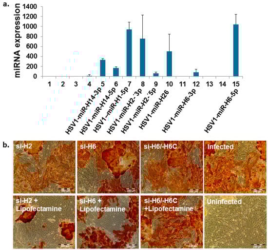 (a) Identification of potential microRNAs in the latent state of HSV-1 infection against HSV-1 target protein, ICP0, by means of NGS-sequencing of differentiated, latently infected human neural progenitor cell line (ReNcell VM). A set of viral miRNAs highly expressed in differentiated ReNcell VM cells has been identified, and the miRNAs sequences, miR-H2 and miR-H6, have been further analyzed for antiviral activity; (b) the antiviral effect of the respective siRNAs in the plaque reduction assay (a confluent layer of HaCaT cells): free si-H2 and siH6 (upper panel) in comparison to siRNAs transfected by lipofectamine (lower panel). The formed syncytia, shown in brownish red, was visualized following immunohistochemistry staining of the cells (anti-HSV1 antibody). Brownish red depicts the envelope-protein of the virus, indicating proliferative infection (scale bar = 200 μm).