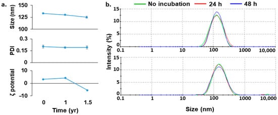LipDOPE-siHSV, suspended in TE buffer and stored at 4 °C for 1.5 yr., was found stable, as evidenced from the insignificant changes of size, PDI, and surface charge (Figure 3a). In addition, siHSV liposomes incubated in serum were found stable after 24 and 48 h, as suggested from the insignificant change of size (Figure 3b).