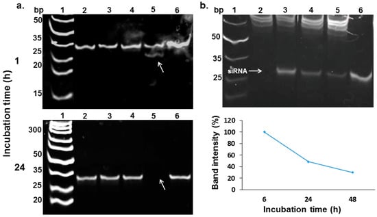Evaluation of encapsulated siHSV stability in simulated physiological conditions. (a) The integrity of siHSV extracted from Lip-siHSV following incubation in 50% bovine serum albumin at 37 °C for 1 and 24 h: (1) Ladder; (2) extracted siHSV incubated in TE buffer; (3) extracted siHSV incubated in serum; (4) free siHSV incubated in TE buffer; (5) free siHSV incubated in serum; and (6) free siHSV without incubation. An aliquot of each sample (200 nM) was analyzed by native 24% acrylamide gel, stained with SYBER Gold. (b) The integrity of encapsulated siHSV in comparison to a spiked sample of empty liposomes with siHSV (200 nM) in keratinocytes (HaCaT) cell cultures: (1) ladder; (2) empty liposomes spiked with siHSV after 6 h; (3) Lip-siHSV after 6 h; (4) Lip-siHSV after 24 h; (5) Lip-siHSV after 48 h; and (6) free siHSV with no incubation. The semi-quantification (ImageJ analysis) of siHSV bands intensities is shown at the lower right-hand part of b. An aliquot from each sample of extracted RNA was analyzed (200 nM) by native 24% acrylamide gel, stained with ethidium bromide, and visualized. Free siHSV with no incubation (lane 6) was set as 100% recovery.