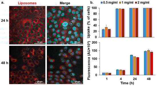 The internalization of LipDOPE by keratinocytes (HaCaT) cell culture. Qualitative (confocal microscopy; (a) quantitative (flow cytometry analysis; and (b) assessment of cellular uptake of LipDOPE (fluorescently labeled with Rhodamine-PE; 2 mg/mL lipids concentration). The liposomal membrane is depicted in red, and cell’s nuclei in cyan (scale bar = 50 μm). The fluorescence intensities were normalized to untreated cells (mean ± SD).