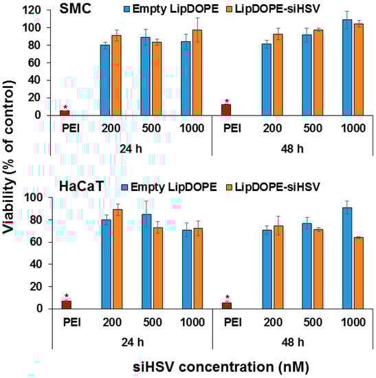 The cytotoxicity of LipDOPE was evaluated in SMC and HaCaT cultures (Figure 6). Both empty LipDOPE and LipDOPE-siHSV exhibited no cytotoxic effect on SMC up to 48 h in comparison to both untreated cells and cells treated with PEI (negative and positive controls, respectively). However, moderate cytotoxicity was detected in HaCaT cells 48 h following treatment with LipDOPE-siHSV at a high concentration of 1000 nM (Figure 6). Only two of the six examined formulations (formulations #4 and #6; Table S1) demonstrated cytotoxic effect in HaCaT cells (Figures S5 and S7).