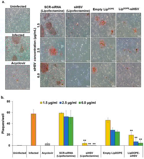 The dose-dependent treatment efficacy against HSV-1 infection was evaluated in a plaque reduction assay of keratinocytes. The virus syncytia—multinucleated cells formed by multiple cell fusions induced by HSV-1—were qualitatively and quantitatively determined (Figure 7). To determine specific and unspecific effects, we used siHSV and SCR-siRNA, respectively, transfected with lipofectamine, which is a well-known transfection reagent. Both treatments of LipDOPE-siHSV and free siHSV (lipofectamine) exhibited significantly high antiviral efficacy similar to acyclovir treatment. In contrast, the other examined formulations (Table S1) were found to be inactive (Figures S8–S10). LipDOPE-siHSV treatment resulted in dose-dependent efficacy, eradicating the virus at 2.5 and 6.0 µg/mL, whereas siHSV in lipofectamine was highly effective at a lower concentration of 1.5 µg/mL. In addition, treatments with empty liposomes resulted in modest antiviral efficacy, whereas SCR-siRNA (lipofectamine) treatment was found to be ineffective.