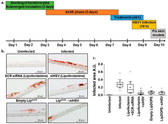 The antiviral effect of LipDOPE-siHSV (DOTAP:siHSV N:P of 5:1) against HSV-1 infection in the 3D epidermis model of immortalized keratinocytes (HaCaT). (a) Illustration of the experimental setup. (b) Qualitative assessment of the treatments by immunohistochemistry of epidermis tissues treated with LipDOPE-siHSV (2.5 µg/mL), scrambled-siRNA (SCR) transfected by lipofectamine (1.5 µg/mL) and empty LipDOPE (negative controls), and siHSV transfected by lipofectamine (1.5 µg/mL; positive control), in comparison to uninfected and untreated infected cells. The epidermis tissues were infected with HSV-1 after 48 h and were analyzed after 16 h for tissue morphometry and integrity (scale bar = 50 μm). (c) Quantification of the immunohistochemistry staining of three independent experiments (each experiment consisting of two or three individual skin models) is shown in (b) by calculating the infected area in the epidermis tissue.
