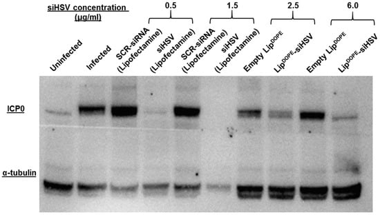 HaCaT cells were seeded in 6-well plates (150 k cells/well) containing the complete growth medium. Uninfected cells and infected untreated cells served as control groups. The cells were pre-treated with Lip-siHSV (2.5 and 6.0 µg/mL siHSV concentration), in comparison to treatments with free siHSV and scrambled siRNA (0.5 and 1.5 µg/mL; transfected by lipofectamine), and empty liposomes. After 48 h incubation of the pre-treated cells, the cells were infected with HSV-1 (5 × 104 PFU) for 16 h and lysed in RIPA-buffer. Cell lysates were supplemented with sample buffer (Bolt LDS Sample Buffer (4×) Thermo Fisher Scientific), heated to 70 °C, separated in a Bolt™ 4–12% Bis-Tris Plus Gel (Thermo Fisher Scientific), and transferred onto a nitrocellulose membrane with an iBlot 2 Gel Transfer Device. After blocking with 5% (w/v) nonfat milk powder in TBST, membranes were incubated with primary antibodies, α-tubulin (DM1A at 1:1000 in TBST, Calbiochem CP06) and HSV1 ICP0 (5H7 at 1:5000 in TBST, Abcam ab6513). Bound antibodies were detected with the Peroxidase AffiniPure Goat Anti-Mouse IgG antibody (1:10,000 in TBST, Jackson Immunoresearch Laboratories, Inc., West Grove, PA, USA). For detection, SuperSignal West Dura Extended Duration Substrate (Thermo Fisher Scientific) was added to the membranes, and the signals were recorded by means of a Luminescent Image Analyzer (LAS-1000 plus; Fujifilm, Tokyo, Japan).