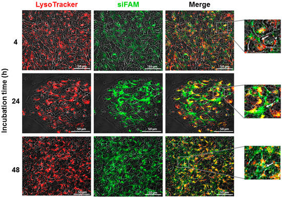 HaCaT cells were seeded on coverslips in 12-well plates (100 k cells/well) containing the complete growth medium and were left overnight to adhere. Cells were incubated for 4, 24, and 48 h with fluorescently labeled siFAM liposomes (6 µg/mL total siRNAs). Late endosomes/lysosomes were stained by adding LysoTracker (75 nM, Red DND99, Life Technologies, Thermo Fisher Scientific) 1 h prior to the end of the incubation period. The cells were thereafter washed with PBS (×3), were fixed using 4% formaldehyde solution for 10 min, were washed again with PBS (×3), and were mounted onto microscope slides. Slides were analyzed by means of confocal microscopy (magnification of ×60). Untreated cells served as control.