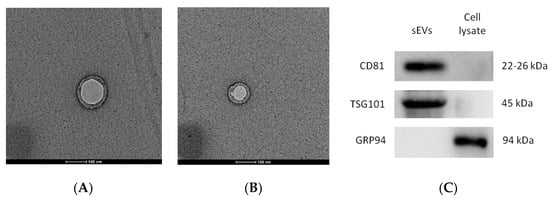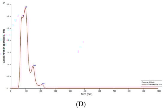 The micrographs of the hUC-MSCs-sEVs from transmission electron microscopy (TEM) displayed a bilayer membrane of cup-like morphology with a diameter around 100 nm (Figure 1A,B). The Western blot analysis of hUC-MSCs-sEVs showed positive bands for exosomal markers CD81, TSG101 and negative for GRP94 (Figure 1C). GRP94 is an endoplasmic reticulum marker that is absent in sEVs. It should be noted that the GRP94 expression was detected in cell lysate but not in sEVs. NTA showed that hUC-MSCs-sEVs have a mode of particle size at 97 nm, while other peaks of particle size were 74, 149 and 209 nm. Overall, the particle size of sEVs was less than 220 nm (Figure 1D). The protein concentration of our hUC-MSCs-sEVs was approximately 5 mg/mL.