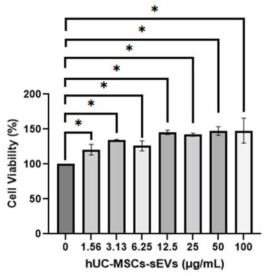 MTT assay was used to investigate the cytotoxic effect of hUC-MSCs-sEVs on HSkMCs. In Figure 2, all concentrations of hUC-MSCs-sEVs treatment groups showed a significantly higher percentage of viability (p < 0.05) than untreated-HSkMCs for 48 h. The viability of hUC-MSCs-sEVs-treated HSkMCs ranged from 120.6 ± 7.5% to 148.0 ± 17.8%. The highest percentage of cell viability was observed at 100 µg/mL of the hUC-MSCs-sEVs treatment group.