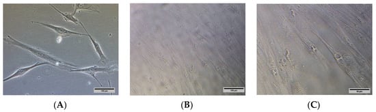 (A) Undifferentiated HSkMCs and (B) differentiated HSkMCs into fused multinucleated myotubes (yellow arrows). (C) Enlarged image of (B), scale bar represents 50 µm. Images were captured under Nikon Eclipse Ti™ inverted light microscopy. (A,B): 200× magnification, scale bar represents 100 µm.