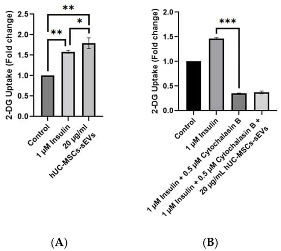 2-DG uptake by HSkMCs with and without CB treatment. (A) Comparison of insulin and hUC-MSCs-sEVs on stimulation of 2-DG uptake by HSkMCs. Treatment of hUC-MSCs-sEVs at 20 µg/mL showed a significant increase in 2-DG uptake by HSkMCs. (B) Effect of hUC-MSCs-sEVs on 2-DG uptake by cytochalasin B-treated HSkMCs. Cytochalasin B treatment at 0.5 µM significantly reduced the 2-DG uptake in HSkMCs. However, hUC-MSCs-sEVs seems unable to reverse the action of cytochalasin B. Data are expressed as the mean ± SD of at least three independent assays with triplicate samples in each assay (* p < 0.05, ** p < 0.01, *** p < 0.001, one-way ANOVA with Tukey post hoc tests).