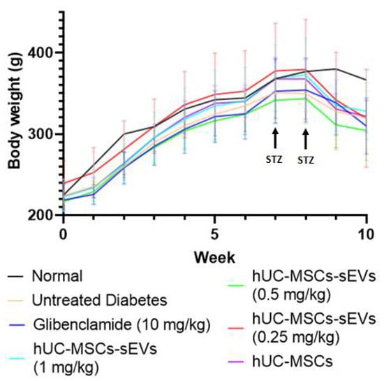In addition, the body weight of rats was measured weekly over the study (Figure 5). The body weight of all groups of rats increased steadily over the time before STZ injection, where no significant difference (p > 0.05) in body weight was observed before the 8th week. Once the diabetic model was confirmed during the 8th week, all diabetic rats showed significant body weight loss compared to normal rats, reducing by approximately 15% during the 9th and 10th weeks. The body weights of the treatment groups were decreasing with a similar trend to the untreated diabetes group, suggesting that the weight loss was due to diabetes mellitus.
