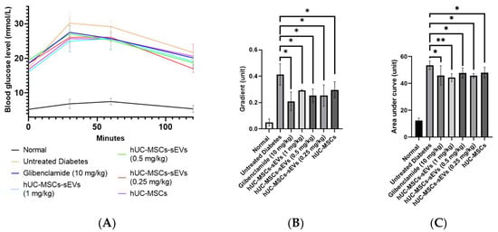 At the end of treatment, an oral glucose tolerance test (OGTT) for 2 h was conducted on all the overnight-fasting rats (Figure 6). At the first 30 min of OGTT (Figure 6B), all groups showed a spike in blood glucose level compared to the non-diabetic animal group. In contrast, the negative group showed the steepest gradient of increase among the other groups. All the treatments of hUC-MSCs-sEVs-treated and hUC-MSCs-treated groups showed significant differences (p < 0.05) compared to the untreated diabetes group. The finding reveals that the sEVs and hUC-MSCs treatment groups had better a glucose tolerance function that could suppress the blood glucose level after glucose intake for 30 min. This further confirms the potential of hUC-MSCs-sEVs as an adjunctive treatment for T2MD. As expected, the hUC-MSCs-treated group showed a similar effect to the hUC-MSCs-sEVs-treated group. This may indicate that the isolated hUC-MSCs-sEVs carry the components of mediators from hUC-MSCs that improve glucose tolerance in the T2DM animal model. Upon calculation of AUC of OGTT at 2 h (Figure 6C), we found a significantly higher AUC (p < 0.05) for the untreated diabetis group compared to the glibenclamide, hUC-MSCs-sEVs and hUC-MSCs treatment groups. Correspondingly, this shows that the hUC-MSCs-sEVs treatment could improve the glucose tolerance function of T2DM rats, similar to hUC-MSCs and anti-diabetic drug glibenclamide treatments.