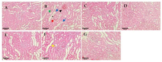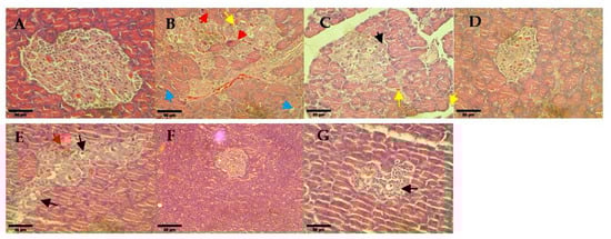 Histological observation of renal glomeruli. (A) Non-diabetes; (B) untreated diabetes; (C) glibenclamide; (D) 0.25 mg/kg hUC-MSCs-sEVs; (E) 0.5 mg/kg hUC-MSCs-sEVs; (F) 1 mg/kg hUC-MSCs-sEVs; (G) hUC-MSCs. The yellow arrow shows a dilated tubule due to loss of tubular lining. The red arrow shows the thickening of the basement membrane of the Bowman’s capsule. The green arrow shows a rupture of the lining epithelium and desquamation of the cells into the lumen. The blue arrows show cytoplasmic vacuolations and oedematous changes. The black arrow shows extravasation of blood with oedema. * shows thickening of the basement membrane of the Bowman’s capsule. All sections were stained with haematoxylin and eosin and viewed under an inverted light microscope. 200× magnification; Scale bar represents 100 µm.