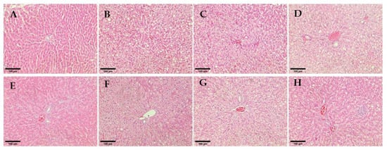 Histological observation of rat hepatocytes for different treatment groups. (A) Non-diabetes; (B) Untreated diabetes; (C) Glibenclamide; (D,E) 0.25 mg/kg hUC-MSCs-sEVs; (F) 0.5 mg/kg hUC-MSCs-sEVs; (G) 1 mg/kg hUC-MSCs-sEVs; (H) hUC-MSCs. All sections were stained with haematoxylin and eosin and viewed under an inverted light microscope. 200× magnification; Scale bar represents 100 µm.