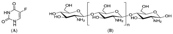Breast cancer is an invasive type of cancer worldwide [], with 18.2% of all cancer deaths worldwide associated with breast cancer []. There are lots of different treatment strategies which have been reported, depending on the type and diagnostic stage of the developed cancer. However, the treatment by chemotherapy remains the most dominant approach [,]. As illustrated in Figure 1, 5-Fluorouracil (5-FU) is a very common anticancer drug that can be administered as a single treatment or as adjuvant therapy in many chemotherapeutic protocols. It has been prescribed to treat different types of cancers, including skin, colon, breast, ovarian, and lung cancers [,]. The anticancer drug, 5-FU, acts by inhibition of essential biosynthetic processes, or by interfering with macromolecules, like DNA and RNA, and interrupting their normal function [].