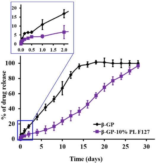 Based on the above, the main objective of this work was the development of a thermosensitive hydrogel from the physical mixture of CS and Pluronic F 127/β-GP for the controlled release of 5-FU. Although this physical combination of polymers has been previously reported by others for intranasal [], vaginal [], intravesical [], ocular [], and injectable cell delivery carrier for cartilage regeneration [], and intra-articular [] delivery, there are no reports of its use for intra-tumoral application in breast cancer. In addition, chitosan/Pluronic gel beads were reported previously [] and utilized for the release of 5-FU. The results indicated that the drug release was extended for just 24 h. Other groups utilized Cs/PL hydrogels for colon [] and colorectal [] delivery of 5-FU. They found that the cumulative release of the drug was achieved within 12 h and 48 h, respectively, depending on the composition of the hydrogel.